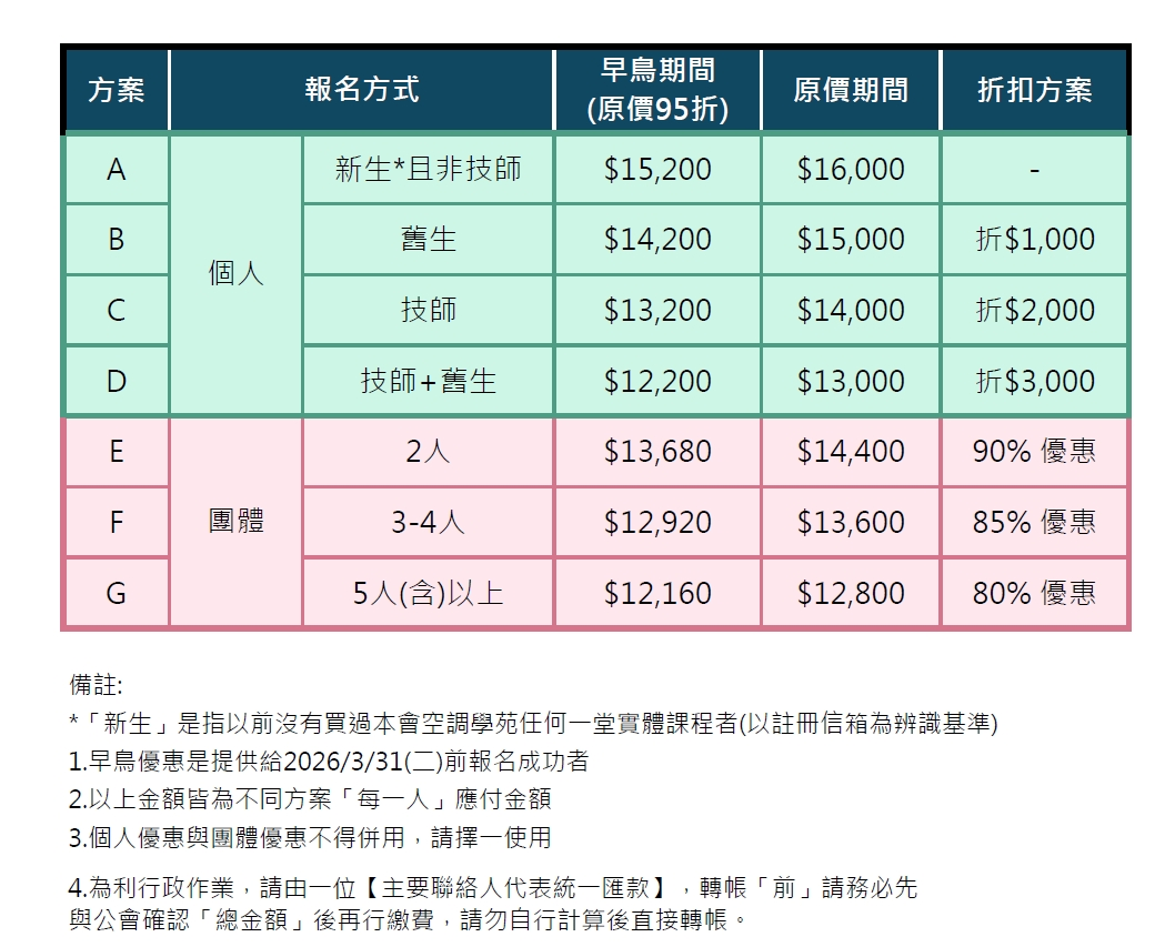 - 5人(含)以上報名,價格為課程公告價格(早鳥/非早鳥)之80%(早鳥期間$12,160/人)。